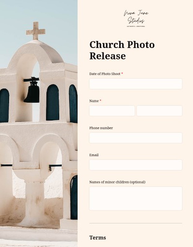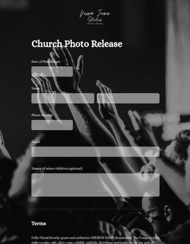 I (the Client) hereby grant and authorize CHURCH NAME (hereinafter The Company) the right to take, edit, alter, copy, exhibit, publish, distribute and make use of any and all photos and videos taken of me (and any minor children) to be used in and/or for any lawful purpose.