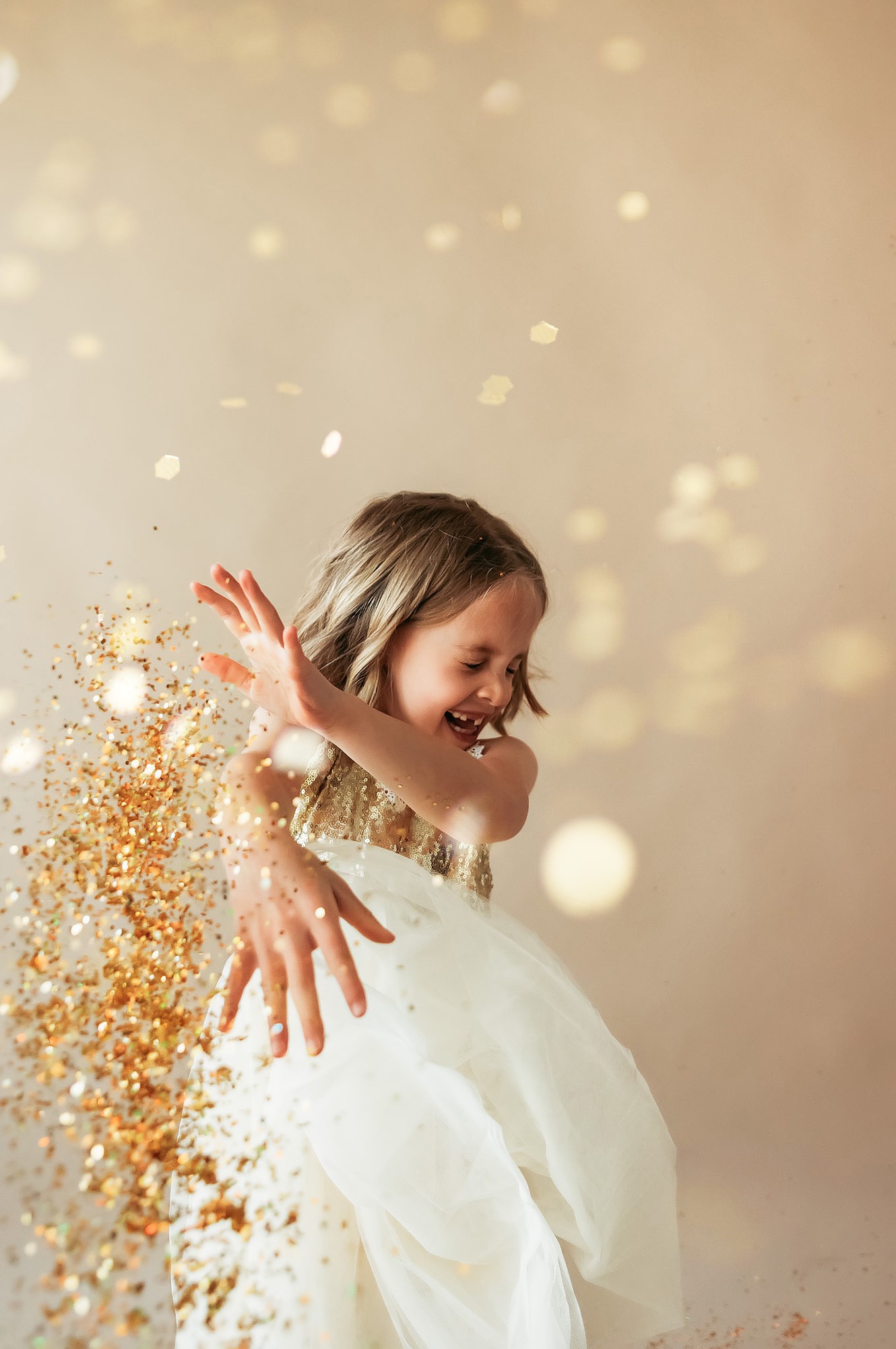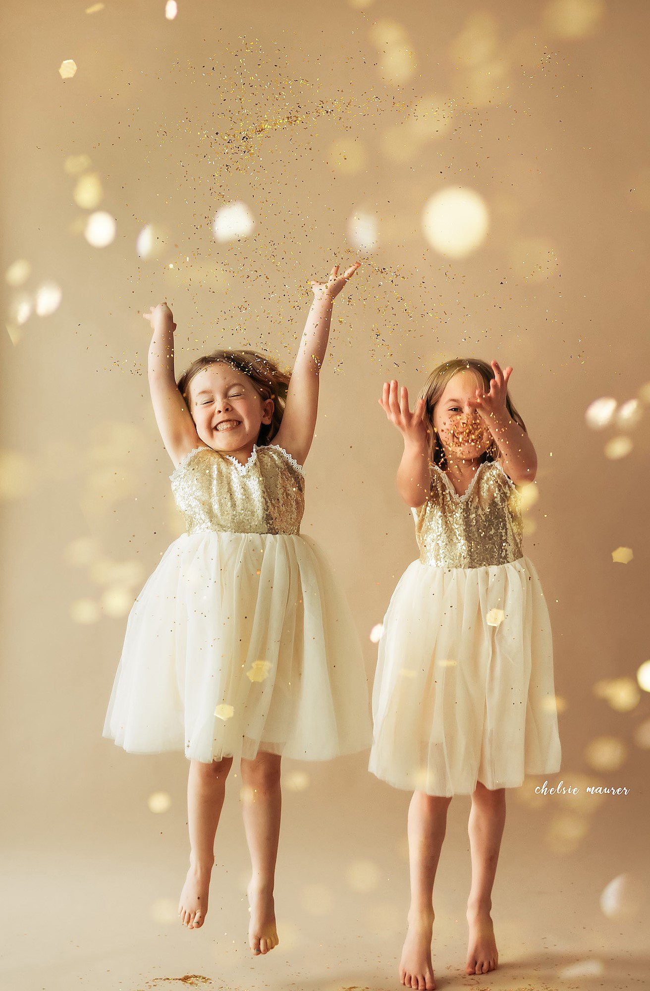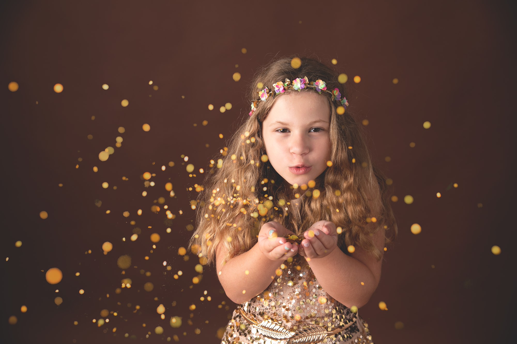Sara says she only offers this shoot for children four-years-old and up. Younger children tend to dislike walking or standing in the glitter due to the texture and are more difficult to direct—they want to throw the glitter everywhere and often get it in their eyes/mouth. For younger children, she uses glitter overlays instead and very little actual glitter.