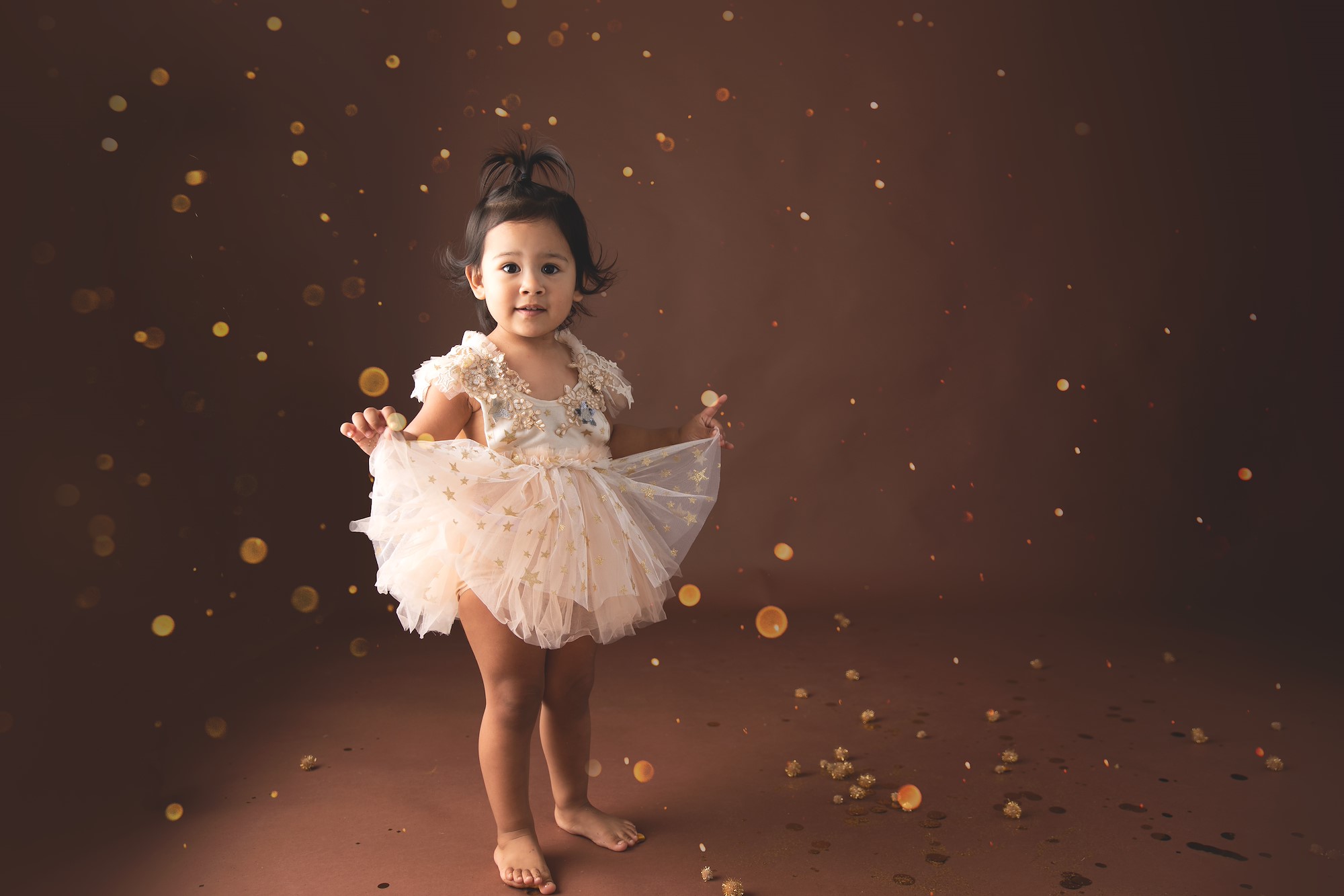 Sara owns a large collection of boutique style dresses in various colors/sizes. Shorter dresses are easier to pose children in, she says, especially for floor poses. If her clients want to select their own outfits, Sara recommends them to various vendors to rent/purchase. She also keeps a collection of crowns and headpieces to wear, but shoes are not needed—those barefoot poses are too sweet and classic to miss!