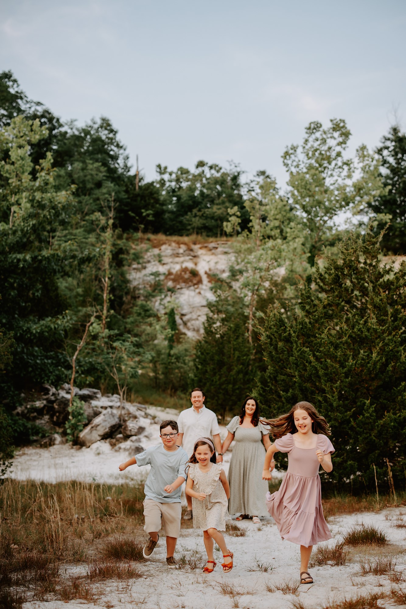 Rachel believes sessions should be stress-free and fun for everyone. She accomplishes this with three simple poses: standing, sitting, and movement. During these poses, she prompts families to look at each other, walk towards her, tickle the kids, etc.