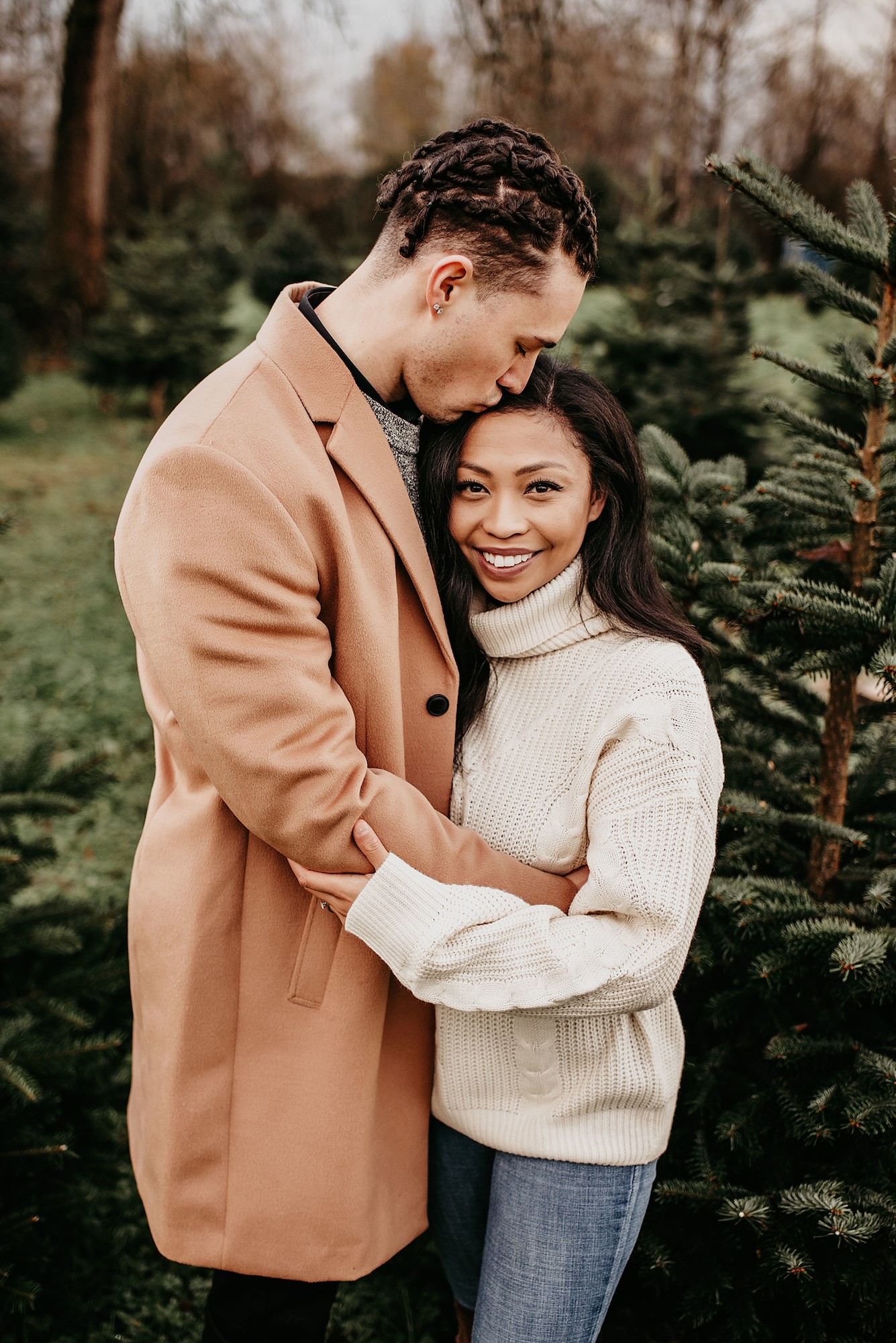 The beauty of shooting at a Christmas tree farm is that the farm, itself, is full of props, so you can bring minimal props of your own. “I bring a few blankets, but my photography is much more about the setting and the connection than holiday-themed props,” says Dickerson.